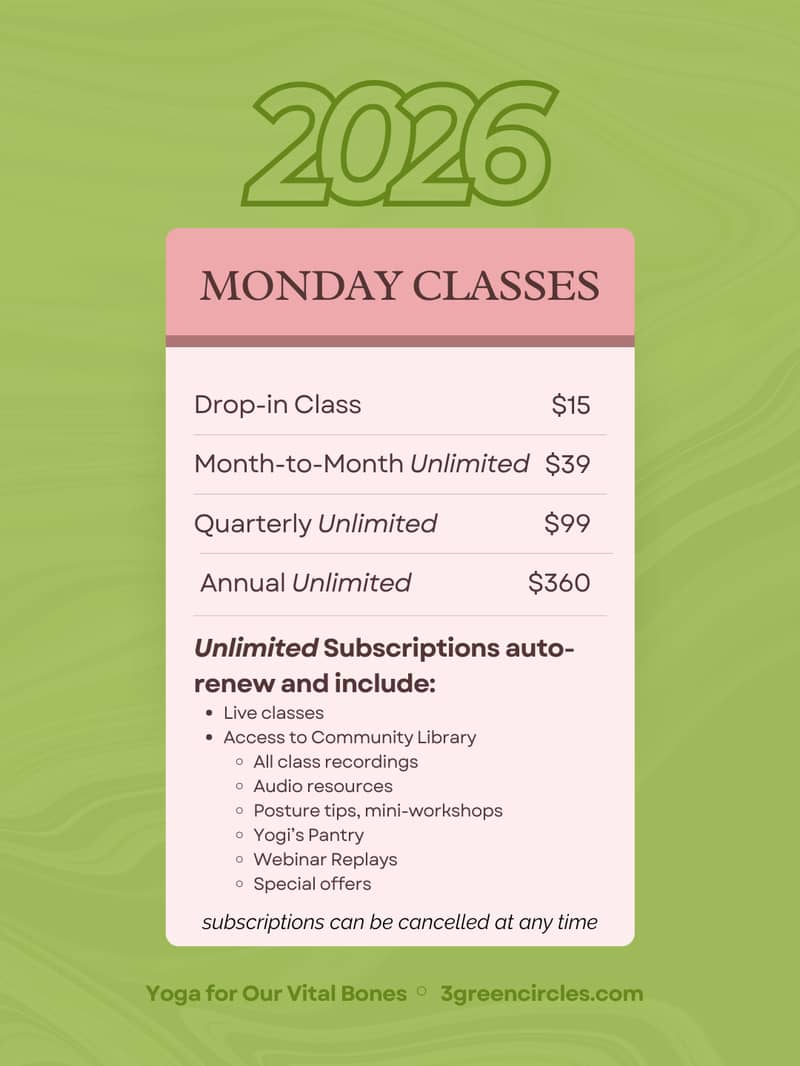 I am BoneFit™ trained and have over 30 years of experience practicing and studying yoga primarily in the Krishnamacharya breath-centered lineage. I approach my daily practice and 15 years of teaching with an academic mind and a curious heart to better understand and convey the biopsychosocial-spiritual approach to addressing bone health through a focus on whole health. More about me here: www.3greencircles.com